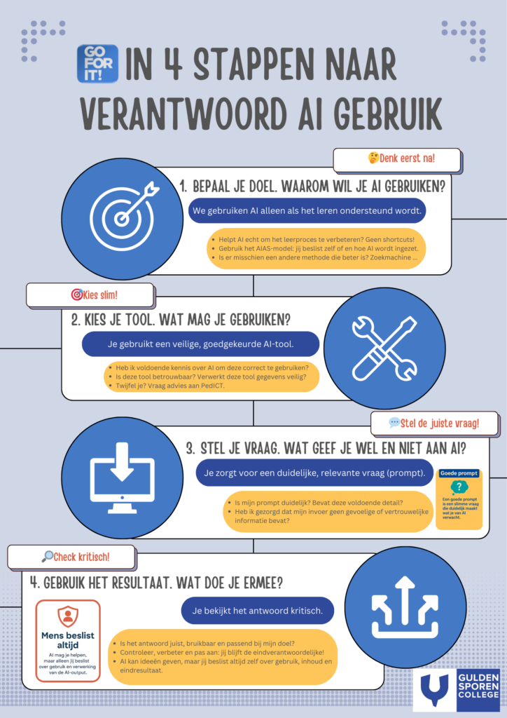 Wat betekent dit beleid nu concreet? We vatten de belangrijkste afspraken rond AI-gebruik samen in 4 duidelijke stappen. Of je nu leerling of leraar bent: deze 4 stappen helpen je om AI veilig, bewust en doelgericht in te zetten, in lijn met ons pedagogisch project.